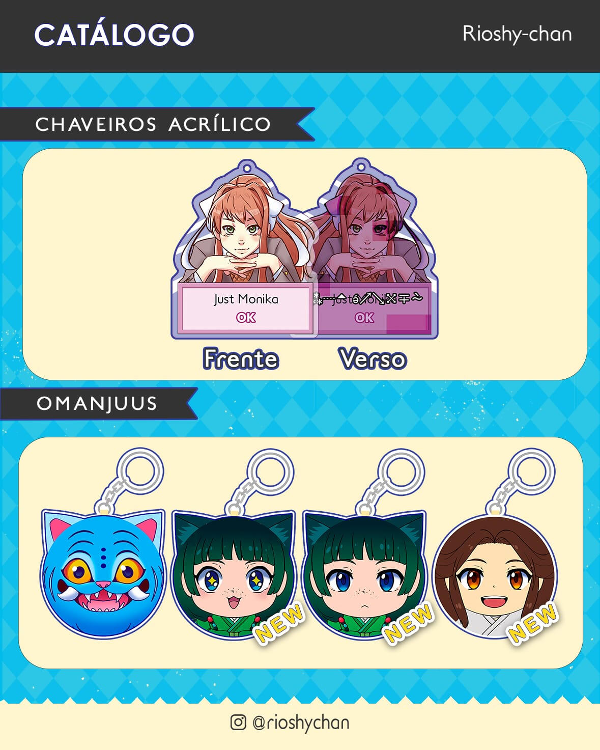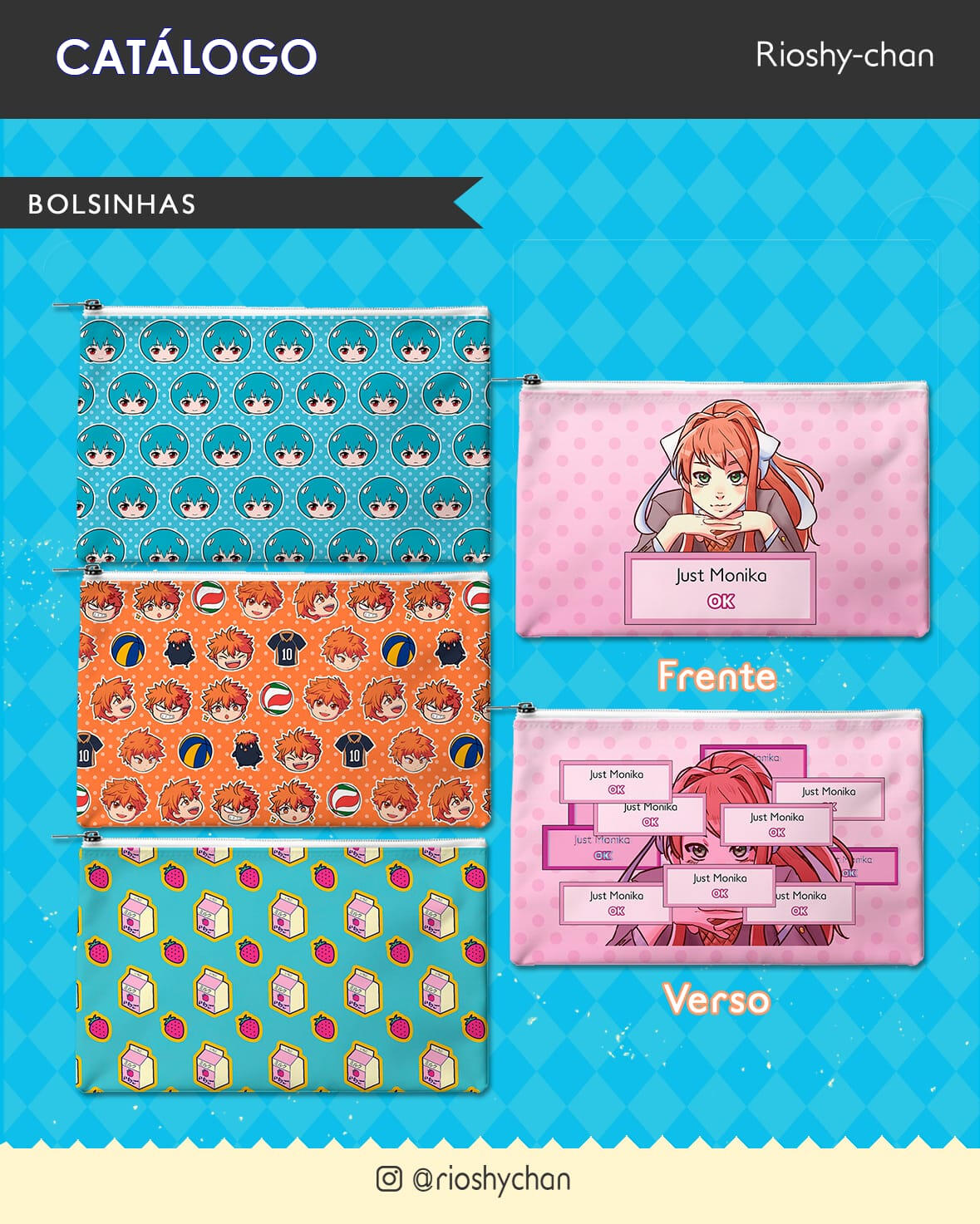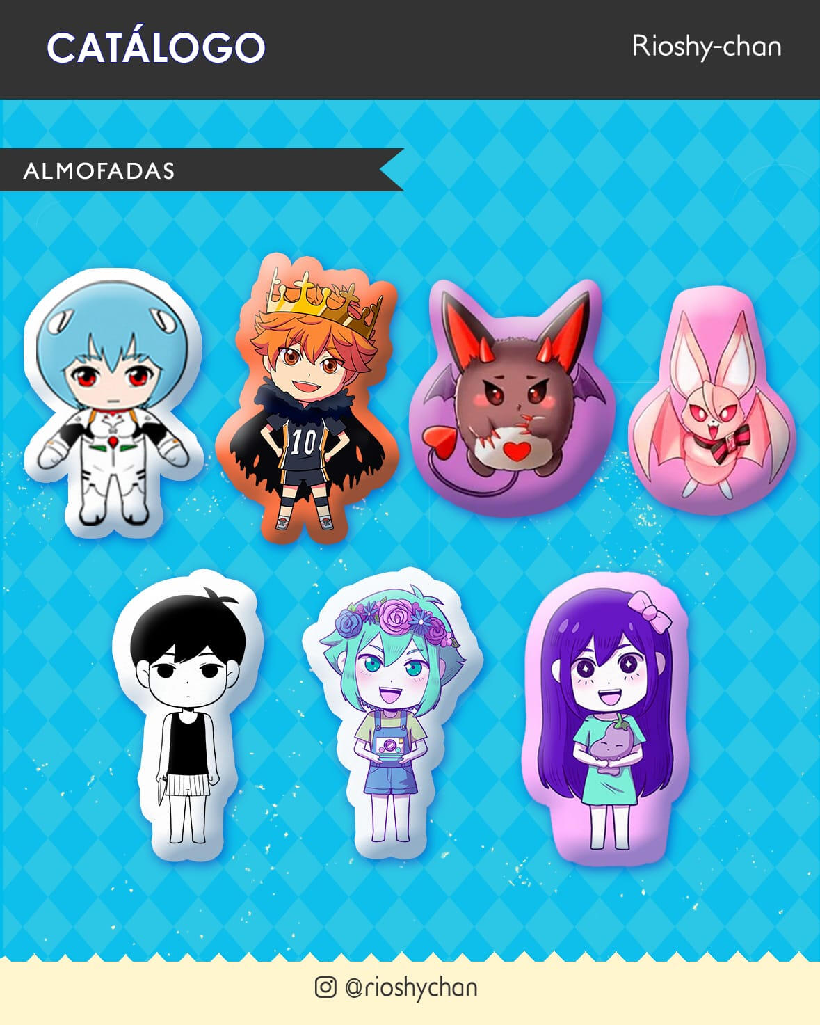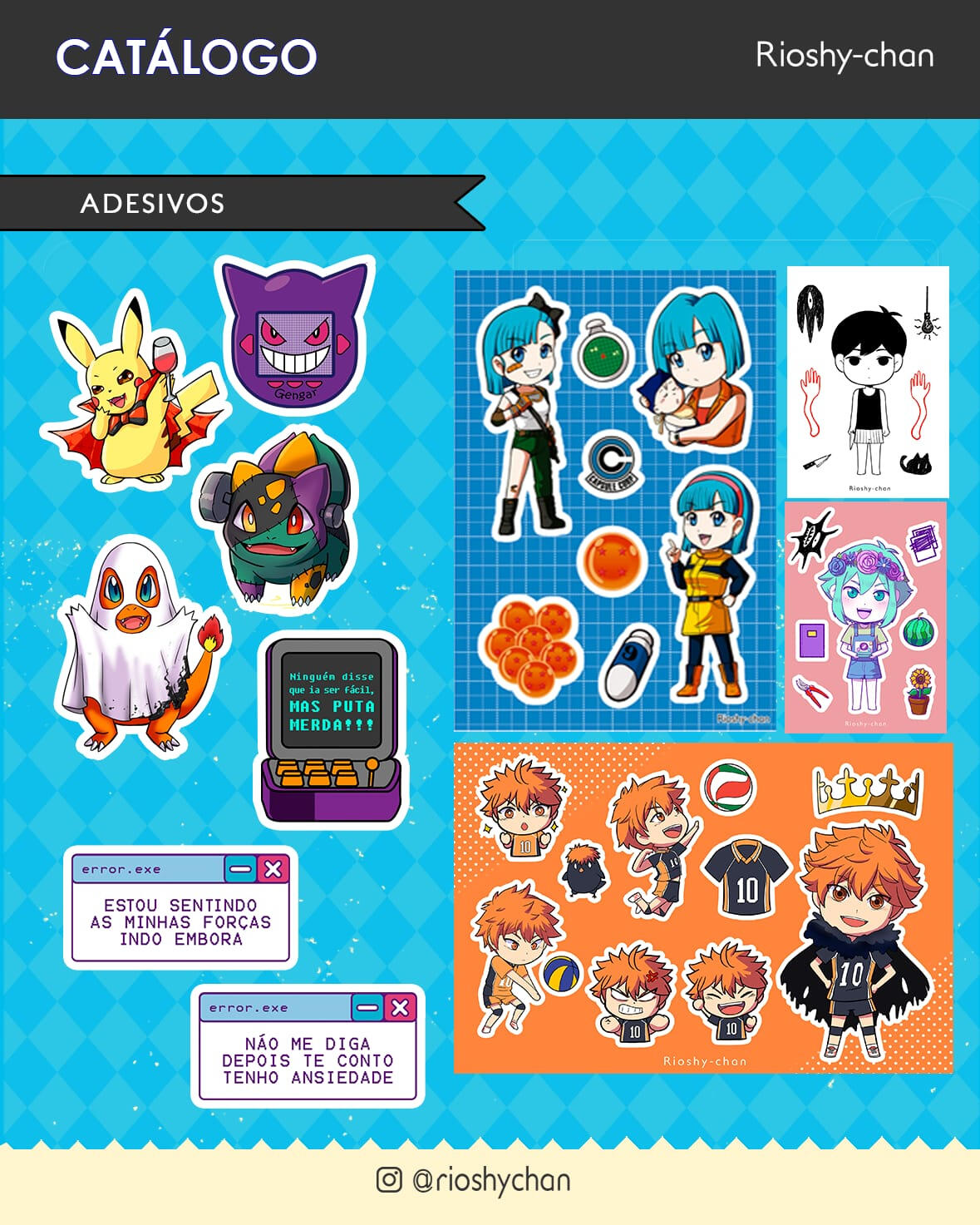 Me chamo Melinda Vasconcelos, mas assino meus desenhos como Rioshy-chan.Costumo divulgar meus trabalhos nas redes sociais, eventos, feirinhas, artists' alley, qualquer lugar onde me deixarem montar minha mesa.